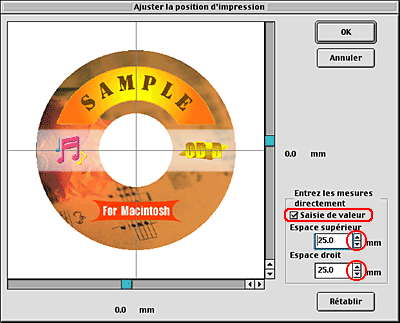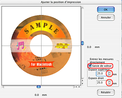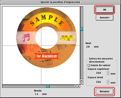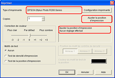 Sélectionnez Ajuster la position d'impression dans le menu Fichier. La zone de dialogue Ajuster la position d'impression s'affiche.