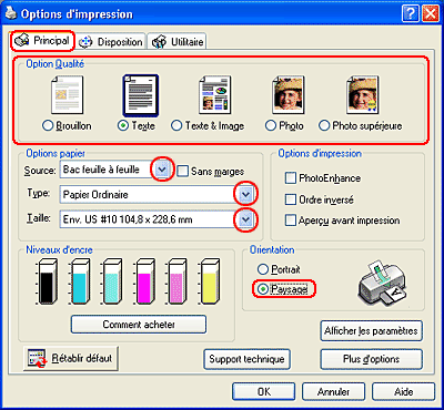La configuration personnalisée Economie et l'option Economie proposée pour le paramètre Qualité dans la zone de dialogue Plus d'options ne sont pas activées pour l'impression d'enveloppes.