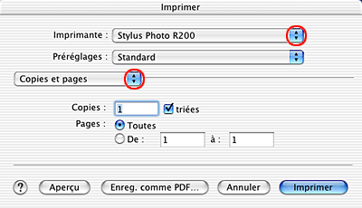 Sélectionnez Stylus Photo R200 pour le paramètre Imprimante, puis réglez le paramètre Copies et pages