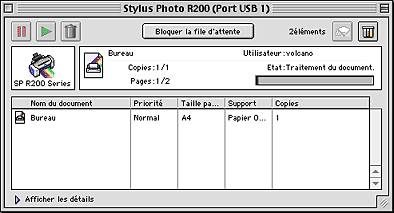 Après avoir lancé une impression, le bouton EPSON Stylus Photo R200 Series apparaît dans la barre des tâches. Cliquez sur ce bouton pour ouvrir EPSON Spool Manager.