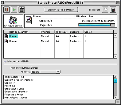 Après l'envoi d'un travail d'impression à l'imprimante, vous pouvez utiliser l'utilitaire EPSON MonitorIV pour vérifier, annuler ou modifier la priorité des travaux d'impression mis en file d'attente. Cet utilitaire montre aussi l'état du travail en cours d'impression