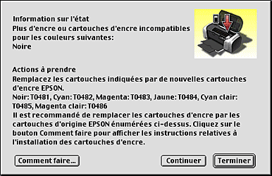 Quand il n'y a presque plus d'encre ou que la cartouche est épuisée, le bouton Comment faire apparaît sous la zone de texte. Cliquez sur Comment faire. L'utilitaire EPSON Status Monitor 3 vous guidera pas à pas tout au long de la procédure de remplacement de la cartouche.