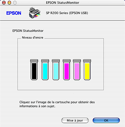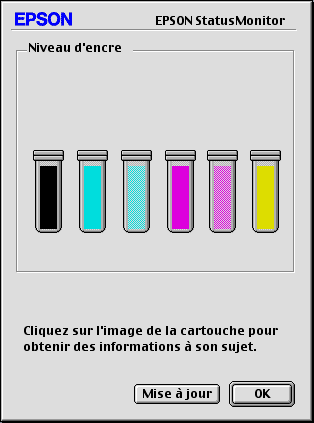 Vous pouvez aussi l'utiliser pour vérifier les niveaux d'encre avant l'impression. Une fois ouvert, EPSON StatusMonitor affiche la quantité d'encre qui restait au moment de son ouverture. Pour mettre à jour les informations relatives au niveau d'encre, cliquez sur Mise à jour.
