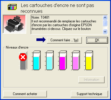 Quand il n'y a presque plus d'encre ou que la cartouche est épuisée, un bouton Comment faire apparaît. Cliquez sur Comment faire. L'utilitaire EPSON StatusMonitor vous guidera pas à pas tout au long de la procédure de remplacement de la cartouche.