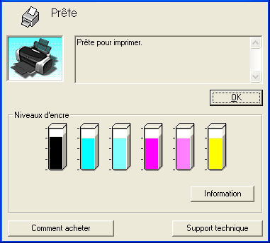 ![]() | Sélectionnez votre imprimante, puis cliquez sur OK. La zone de dialogue Utilitaire d'impression EPSON s'affiche. |