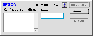 Saisissez un nom unique pour vos paramètres dans la zone de texte Nom et cliquez sur Enregistrer. Le nom peut contenir jusqu'à 16 lettres et chiffres. Vous pouvez aussi utiliser jusqu'à 8 caractères double octet ; il est toutefois possible qu'ils ne s'affichent pas correctement à l'écran en fonction de la configuration de votre système d'exploitation. Votre configuration sera ajoutée à la liste Configuration personnalisée et la dernières configuration personnalisée sera sélectionnée. Vous pouvez enregistrer jusqu'à 100 configurations personnalisées différentes.