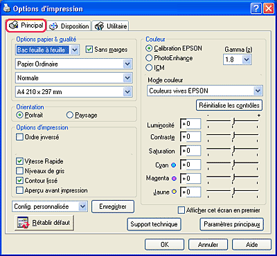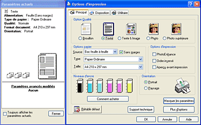L'onglet Principal permet de régler les paramètres Option Qualité, Options papier, Options d'impression, Orientation et Plus d'options, et aussi de vérifier les niveaux d'encre. Reportez-vous à la section appropriée ci-dessous.