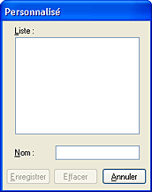 Pour enregistrer vos réglages personnalisés dans la liste Configuration personnalisée, cliquez sur Enregistrer. La boîte de dialogue Personnalisé s'affiche.