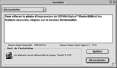 Faites glisser le dossier Guide de référence, situé dans le dossier EPSON Stylus Photo R200 Series, du disque dur vers la corbeille. Ensuite, faites glisser l'icône Guide de référence ESPR200 du bureau vers la corbeille.