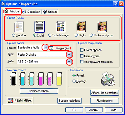 Cliquez sur l'onglet Principal, puis réglez le paramètre Option Qualité. Pour des détails sur le paramètre Option Qualité, reportez-vous au chapitre suivant.