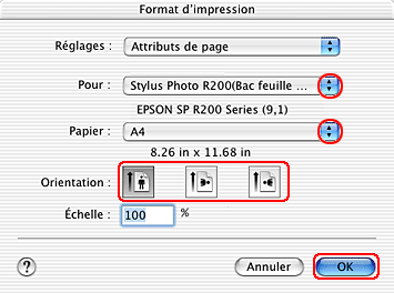 Utilisez toujours le même réglage pour le paramètre Pour de la zone de dialogue Format d'impression et pour le paramètre Imprimante de la zone de dialogue Imprimer. Sinon les données risquent de ne pas s'imprimer correctement.