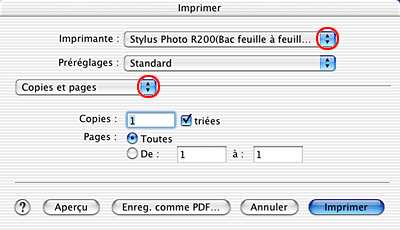 Sélectionnez Stylus Photo R200 (Bac feuille à feuille - Sans marges) pour le paramètre Imprimante, puis réglez les options Copies et pages.