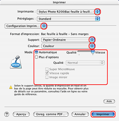 Paramètres du gestionnaire d'impression pour Mac OS X
