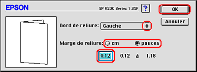 En fonction de votre application, la marge de reliure réelle peut différer des valeurs spécifiées. Essayez avec quelques feuilles pour examiner le résultat avant d'imprimer de gros volumes.
