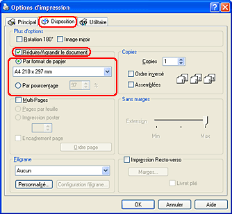 Cliquez sur l'onglet Disposition, puis activez la case à cocher Réduire/Agrandir le document. Vous pouvez sélectionner les options suivantes pour modifier la taille du document.