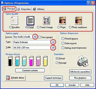 Cliquez sur l'onglet Principal, puis réglez le paramètre Option Qualité. Pour des détails sur le paramètre Option Qualité, reportez-vous au chapitre suivant.
