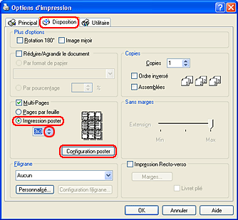 Cliquez sur l'onglet Disposition, sélectionnez Multi-Pages puis Impression poster. Cliquez sur la flèche Haut ou Bas pour sélectionner 2x2, 3x3 ou 4x4.