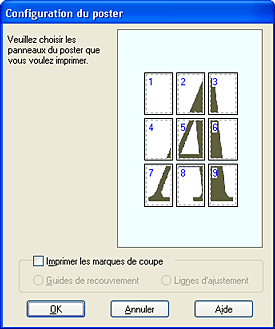Voici un exemple de création de poster pour lequel on sélectionne l'option 2x2 dans la zone Sélection poster et l'option Guide de recouvrement dans la zone Imprimer les marques de coupe. Reportez-vous également aux illustrations jointes.