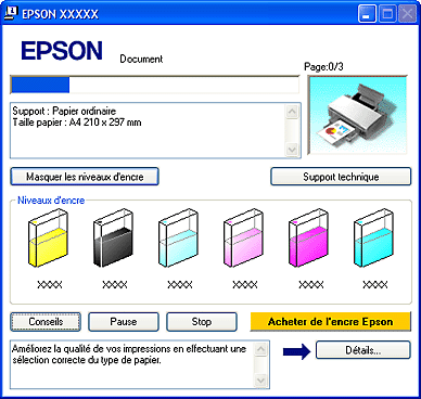 Lorsque le niveau d'encre d'une cartouche est faible, l'écran d'avertissement relatif à un faible niveau d'encre s'affiche automatiquement. Cet écran vous permet également de connaître l'état de la cartouche d’encre. Si vous ne souhaitez pas afficher cet écran, accédez au pilote d'impression, cliquez sur l'onglet Utilitaire, sur Vitesse et Progression, puis sur Préférences du contrôle. Au niveau de l'écran Préférences du contrôle, désactivez la case à cocher Activer l’avertissement relatif à un faible niveau d’encre.