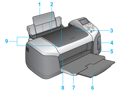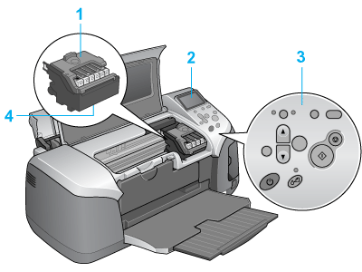 1. Couvercle du logement des cartouches : maintient les cartouches d'encre en place. Ne l'ouvrez que pour installer ou remplacer des cartouches d'encre.