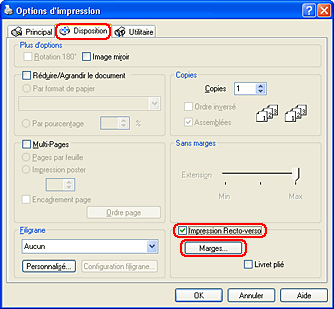Cette fonction n'est pas disponible si vous activez la case à cocher Sans marges dans la zone Options papier du menu Principal (Windows) ou dans la zone de dialogue Format d'impression (Macintosh).