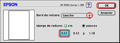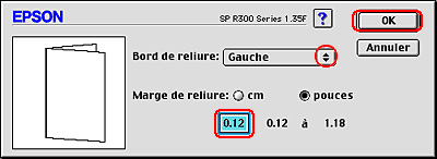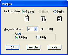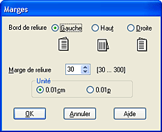 En fonction de votre application, la marge de reliure réelle peut différer des valeurs spécifiées. Essayez avec quelques feuilles pour examiner le résultat avant d'imprimer de gros volumes.