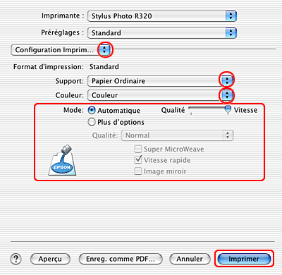 Sélectionnez Stylus Photo R320 pour le paramètre Imprimante, puis réglez le paramètre Copies et pages