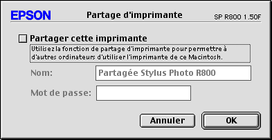 Utilisez le paramètre Partage d'imprimante qui constitue une fonction standard de Mac OS X 10.2 ou plus récent. Cette fonction n'est pas disponible sous Mac OS X 10.1. Pour plus de détails, consultez la documentation de votre système d'exploitation.