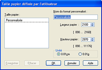 Sélectionnez Personnalisée pour le paramètre Taille. La boîte de dialogue Taille papier définie par l'utilisateur s'affiche