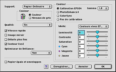 Cette option permet d'utiliser les méthodes de correspondance des couleurs et d'amélioration de l'image fournies par le pilote d'impression. Lorsque vous activez la case à cocher Calibration EPSON, des paramètres supplémentaires s'affichent sous les options de la zone Couleur. Ils vous permettent de sélectionner un mode de couleur et de régler les différents curseurs d'amélioration d'image.