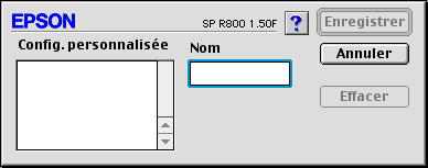 Saisissez un nom unique pour vos paramètres dans la zone de texte Nom et cliquez sur Enregistrer. Le nom peut contenir jusqu'à 16 lettres et chiffres. Vous pouvez aussi utiliser jusqu'à 8 caractères double octet ; il est toutefois possible qu'ils ne s'affichent pas correctement à l'écran en fonction de la configuration de votre système d'exploitation. Votre configuration sera ajoutée à la liste Configuration personnalisée et la dernières configuration personnalisée sera sélectionnée. Vous pouvez enregistrer jusqu'à 100 configurations personnalisées différentes.