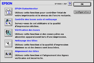 Ce bouton ouvre la zone de dialogue Configuration, dans laquelle vous pouvez modifier la manière utilisée par l'utilitaire EPSON StatusMonitor pour vous prévenir des changements d'état de l'imprimante. |