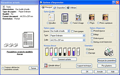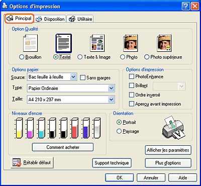 L'onglet Principal permet de régler les paramètres Option Qualité, Options papier, Options d'impression, Orientation et Plus d'options, et aussi de vérifier les niveaux d'encre. Reportez-vous à la section appropriée ci-dessous.