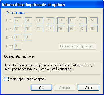 Selon la configuration de votre système, les informations affichées dans la boîte de dialogue Informations imprimante et options se mettront à jour automatiquement ou devront être saisies manuellement.