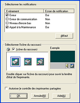 Cliquez sur ce bouton pour ouvrir la boîte de dialogue Préférences du contrôle, dans laquelle vous pouvez définir les paramètres de l'utilitaire EPSON Status Monitor 3.