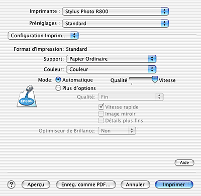 Ce mode offre le moyen d'impression le plus rapide et le plus facile. Le logiciel d'impression définit tous les paramètres détaillés en fonction des paramètres courants Support et Couleur.