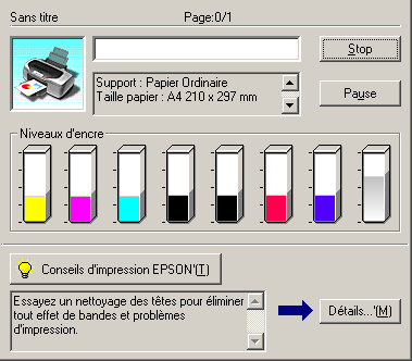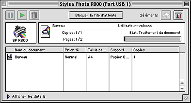 Après le lancement d'une impression, le bouton EPSON Stylus Photo R800 apparaît dans la barre système. Cliquez sur ce bouton pour ouvrir l'utilitaire EPSON Spool Manager.