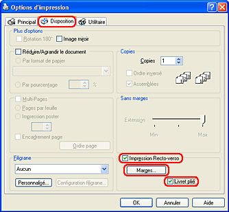 Cette fonction n'est pas disponible si vous activez la case à cocher Sans marges dans la zone Options papier de l'onglet Principal (Windows) ou dans la zone de dialogue Format d'impression (Macintosh).