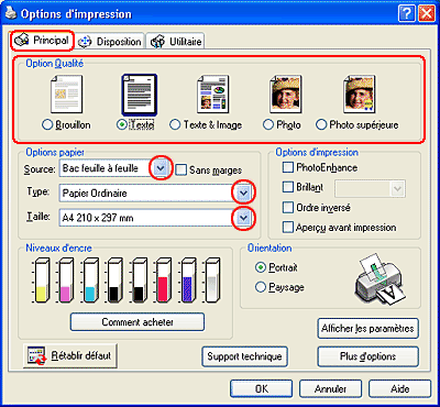 Cliquez sur l'onglet Principal, puis réglez le paramètre Option Qualité. Pour des détails sur le paramètre Option Qualité, reportez-vous au chapitre suivant.