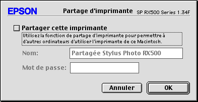 Le paramètre Partage d'imprimante constitue une fonction standard de Mac OS X 10.2 ou plus récent. Cette fonction n'est pas disponible sous Mac OS X 10.1.