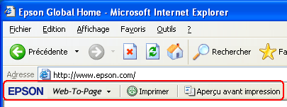 Une fois EPSON Web-To-Page installé, la barre de menus correspondante s’affiche dans la barre d’outils Microsoft Internet Explorer. Si ce n’est pas le cas, sélectionnez Barres d'outils dans le menu Affichage de Internet Explorer et sélectionnez ensuite EPSON Web-To-Page.