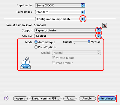 Sélectionnez les paramètres Support, Couleur et Mode adaptés. Pour plus de détails au sujet des Configuration Imprimante, reportez-vous à l'aide en ligne.