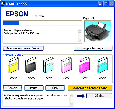 Lorsque le niveau d'encre d'une cartouche est faible, l'écran Rappel niveau d'encre faible s'affiche automatiquement. Cet écran vous permet également de connaître l'état de la cartouche d’encre. Si vous ne souhaitez pas afficher cet écran, accédez au pilote d'impression, cliquez sur l'onglet Utilitaire, sur Vitesse et Progression, puis sur Préferences du contrôle. Désactivez la case à cocher Activer Rappel niveau d'encre faible de l'écran Préferences du contrôle.