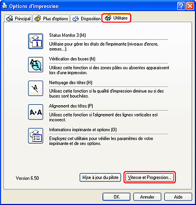 Vous pouvez augmenter la vitesse d'impression en sélectionnant certains paramètres de la fenêtre Vitesse et Progression. Cliquez sur le bouton Vitesse et Progression de la fenêtre Utilitaire du pilote d'impression.