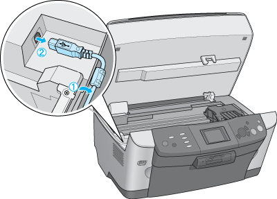 ![]() | Branchez le connecteur du câble USB (qui a été déconnecté du combiné multifonction précédemment) dans le port USB du combiné multifonction, puis insérez le câble USB dans l'emplacement. |