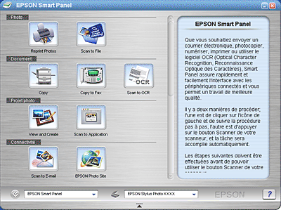 Utilisateurs de Windows : Cliquez sur Démarrer, pointez Tous les programmes (Windows XP) ou Programmes (Windows Me, 98 ou 2000), puis EPSON Smart Panel et cliquez sur EPSON Smart Panel.