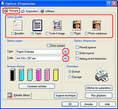 ![]() | Cliquez sur l'onglet Principal, puis réglez le paramètre Option Qualité. Pour plus de détails, consultez l'aide en ligne. |
