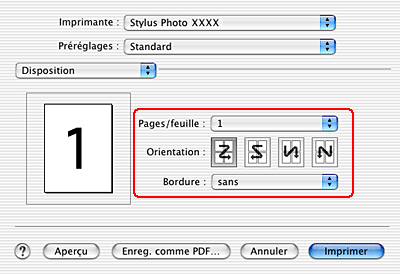 ![]() | Réglez les paramètres suivants pour l'impression Pages par feuille : |
