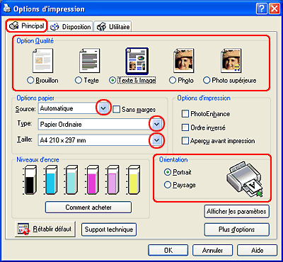 Cliquez sur l'onglet Principal et sélectionnez une des options recommandées ci-dessous pour la qualité. Pour plus de détails au sujet des autres options disponibles pour la qualité, reportez-vous à l'aide en ligne.