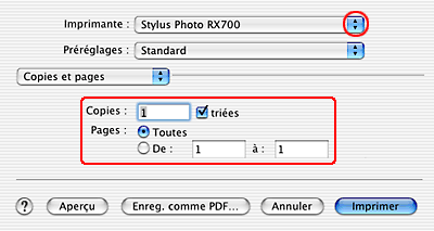 Réglez le paramètre Imprimante comme vous l'avez fait à l'étape 3 avec le paramètre Pour dans la zone de dialogue Format d'impression. Réglez ensuite les options Copies & Pages.